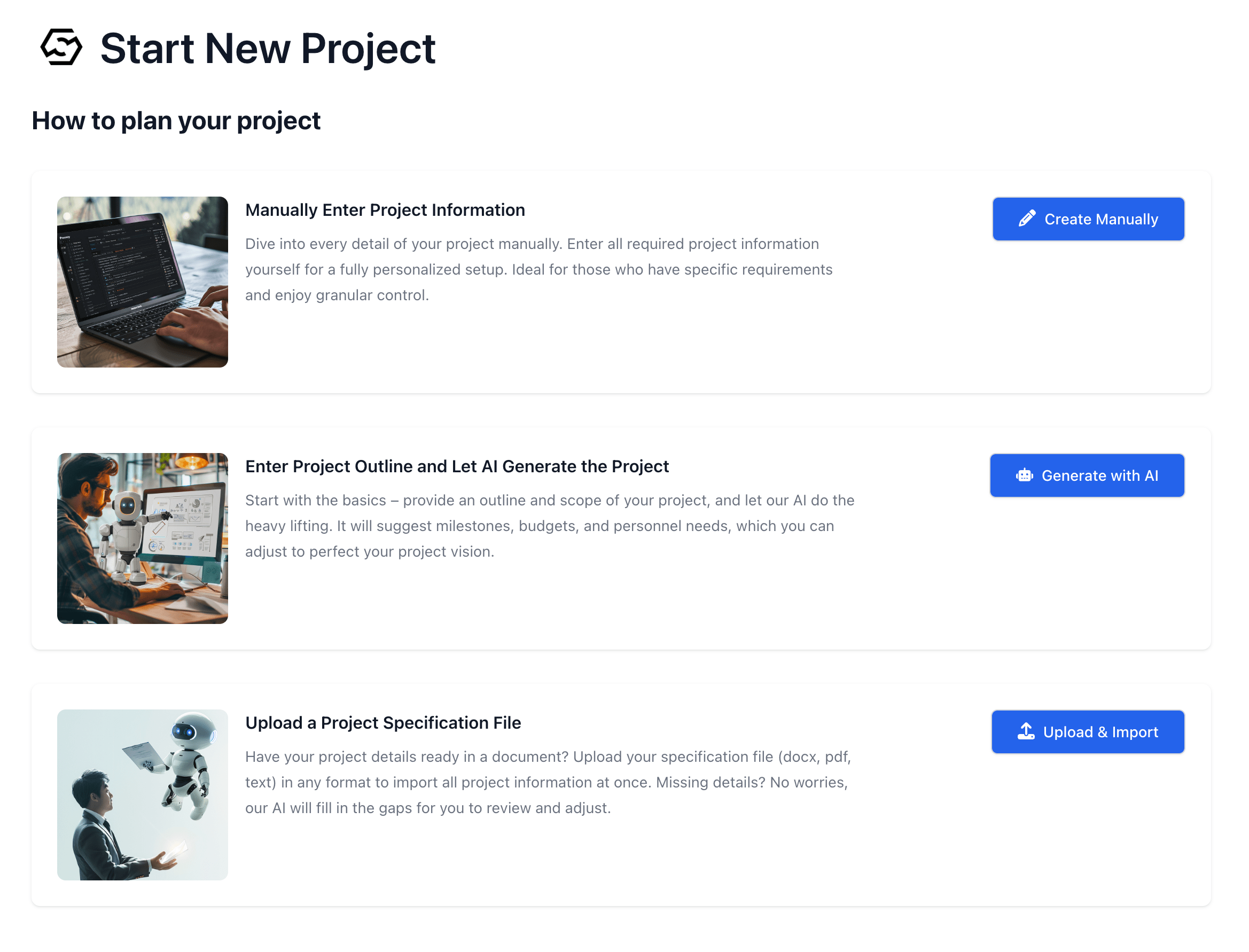 Manually Enter Project InformationorEnter Project Outline and Let AI Generate the ProjectorUpload a Project Specification File- Manually Enter Project Information. See: Interactive Mode