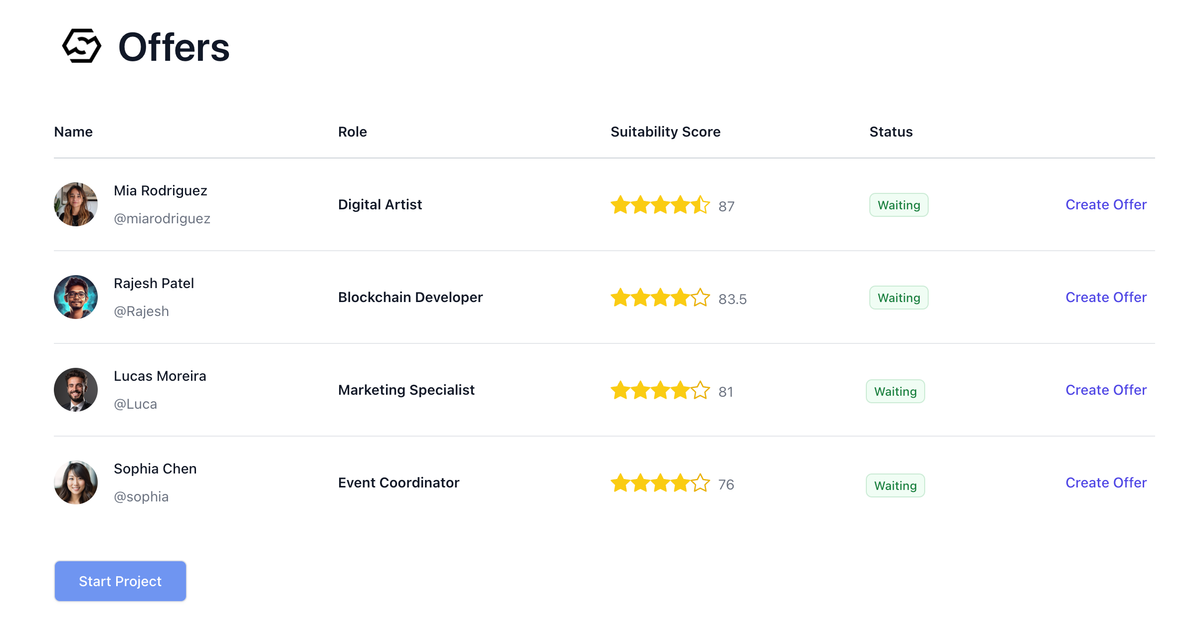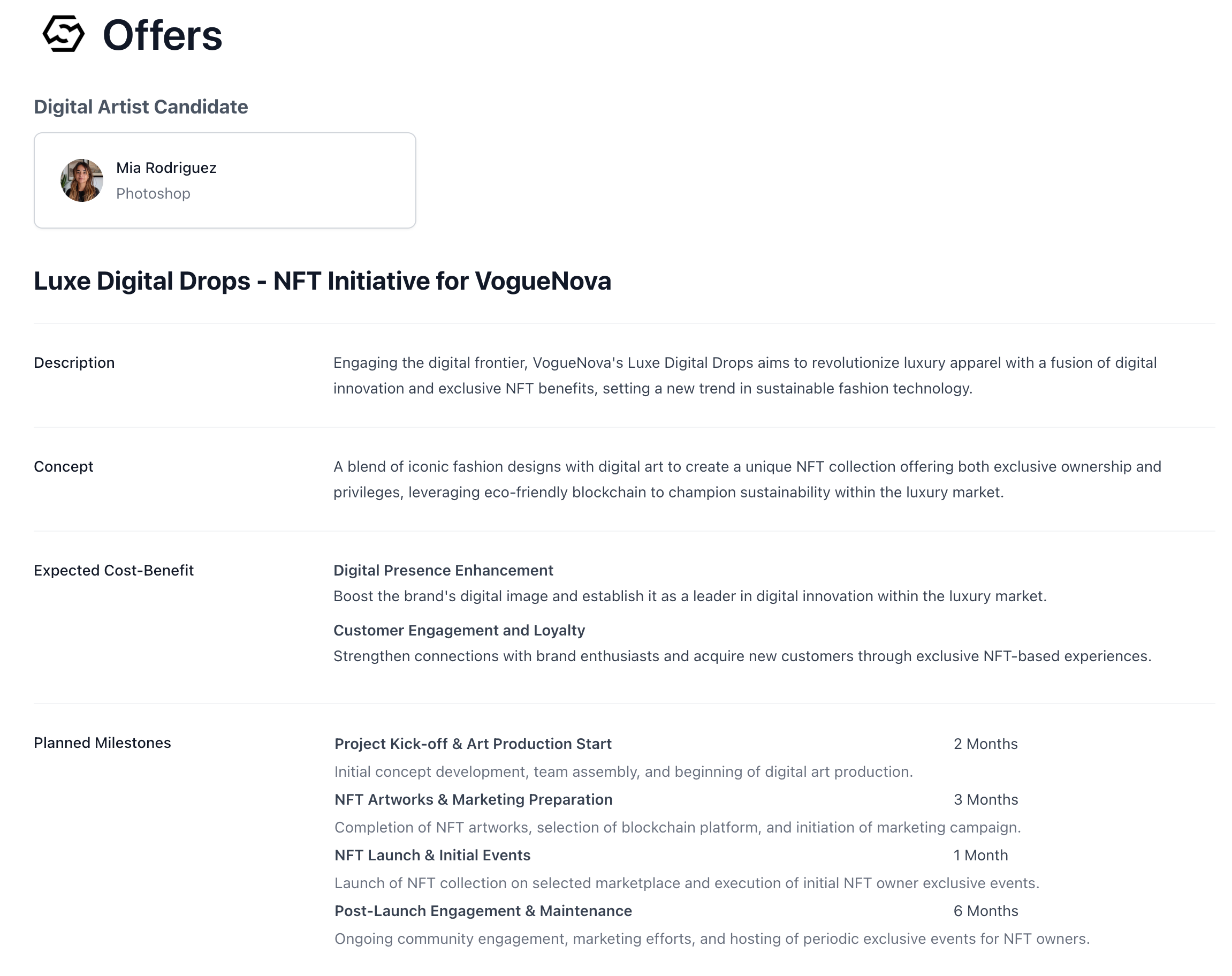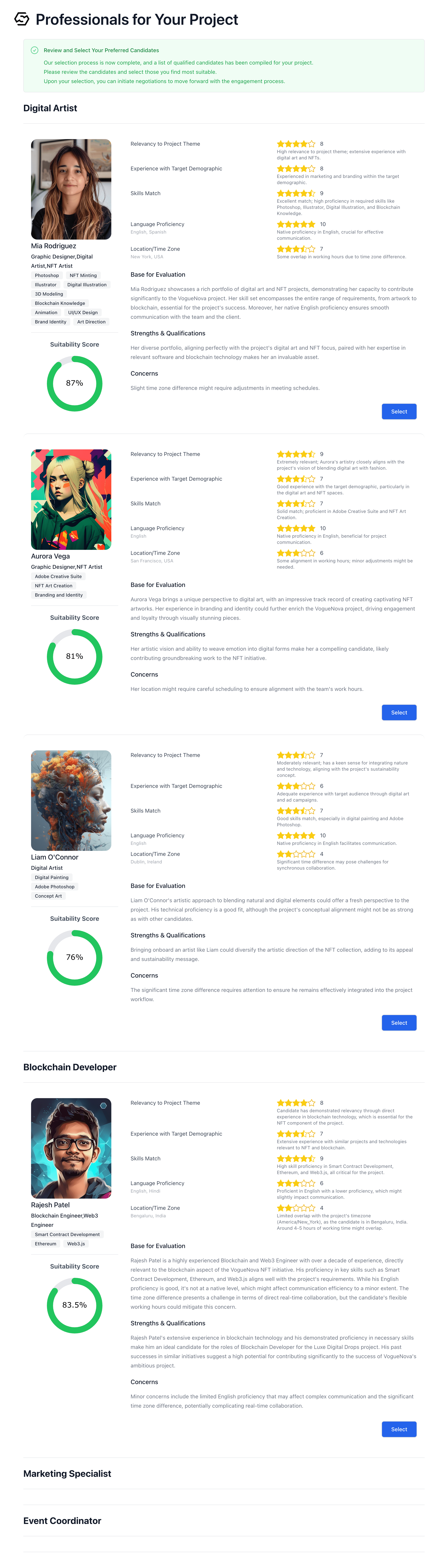 Alex received a notification informing him that Mia had accepted all aspects of the offer. Shortly after, he received similar notifications from the other candidates. Fortunately, everyone he had extended offers to had accepted, giving him a full roster of talented professionals for the project.Kicking Off the Project
