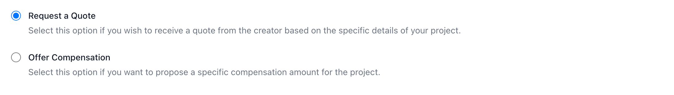 - If he chooses Request a Quote, he does not have to enter anything about the compensation. The creator will send a quote.