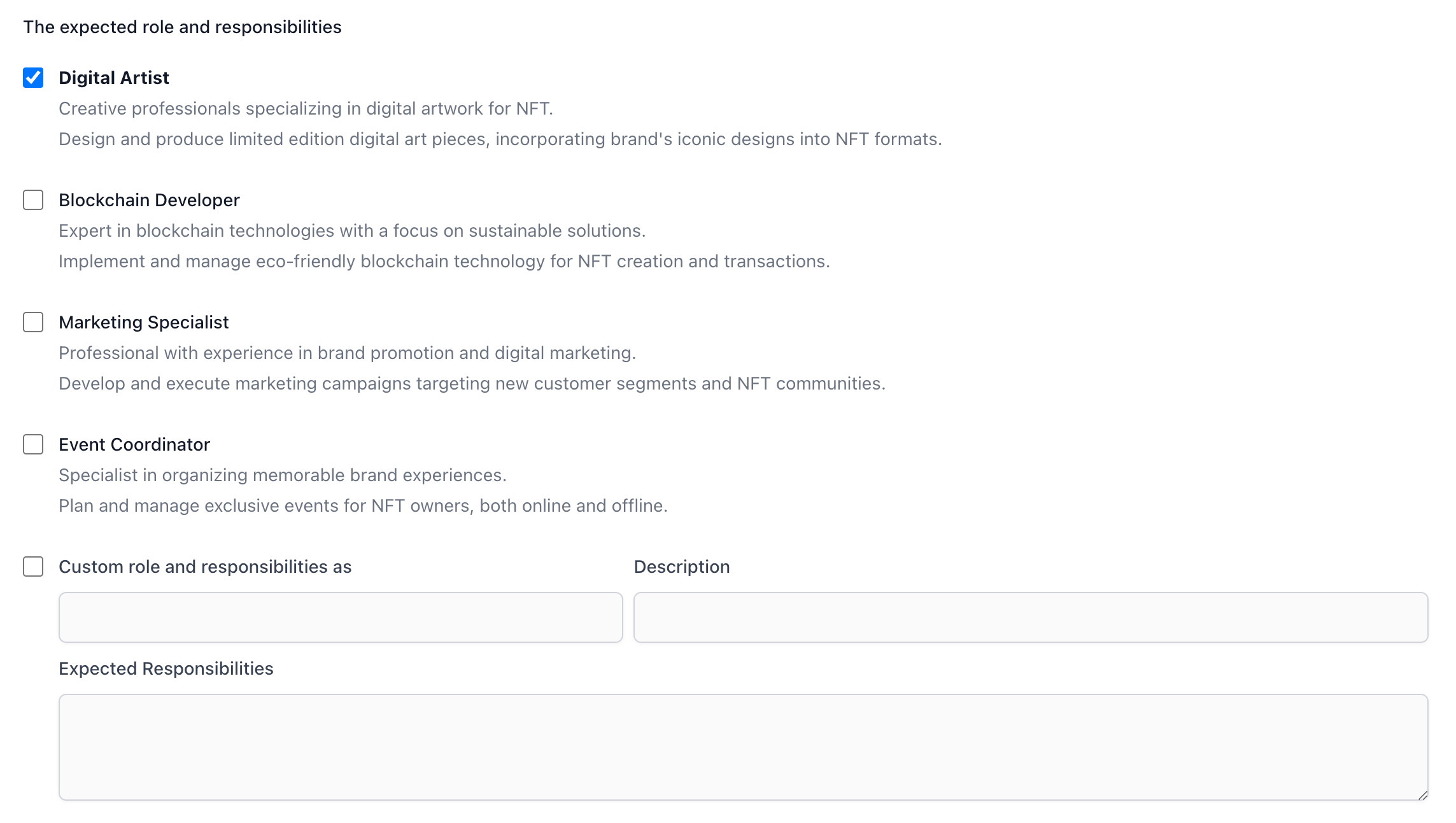 The expected roles and responsibilities. In this case, he selects the responsibilities of the Digital Artist shown in the choices.
