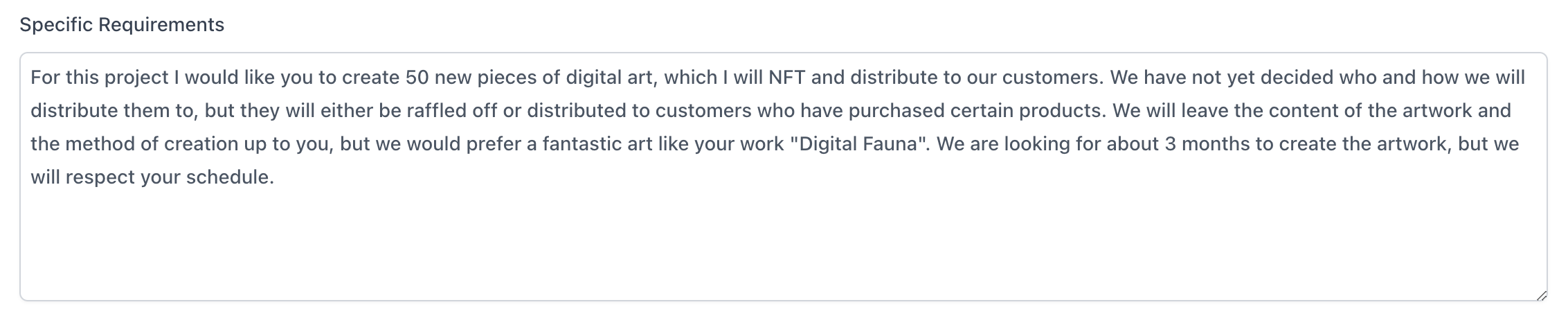 Specific Requirementthat he wants to create 50 pieces of digital art, all of them NFT, to be given to the client as a gift.