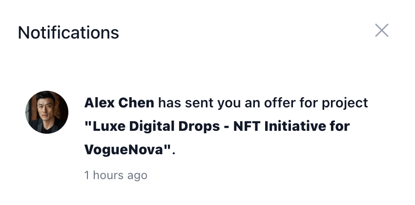 - After Alex sends an offer to Mia, when Mia logs into Byodo, the notification icon in the upper right corner has a green circle. She clicks on it.