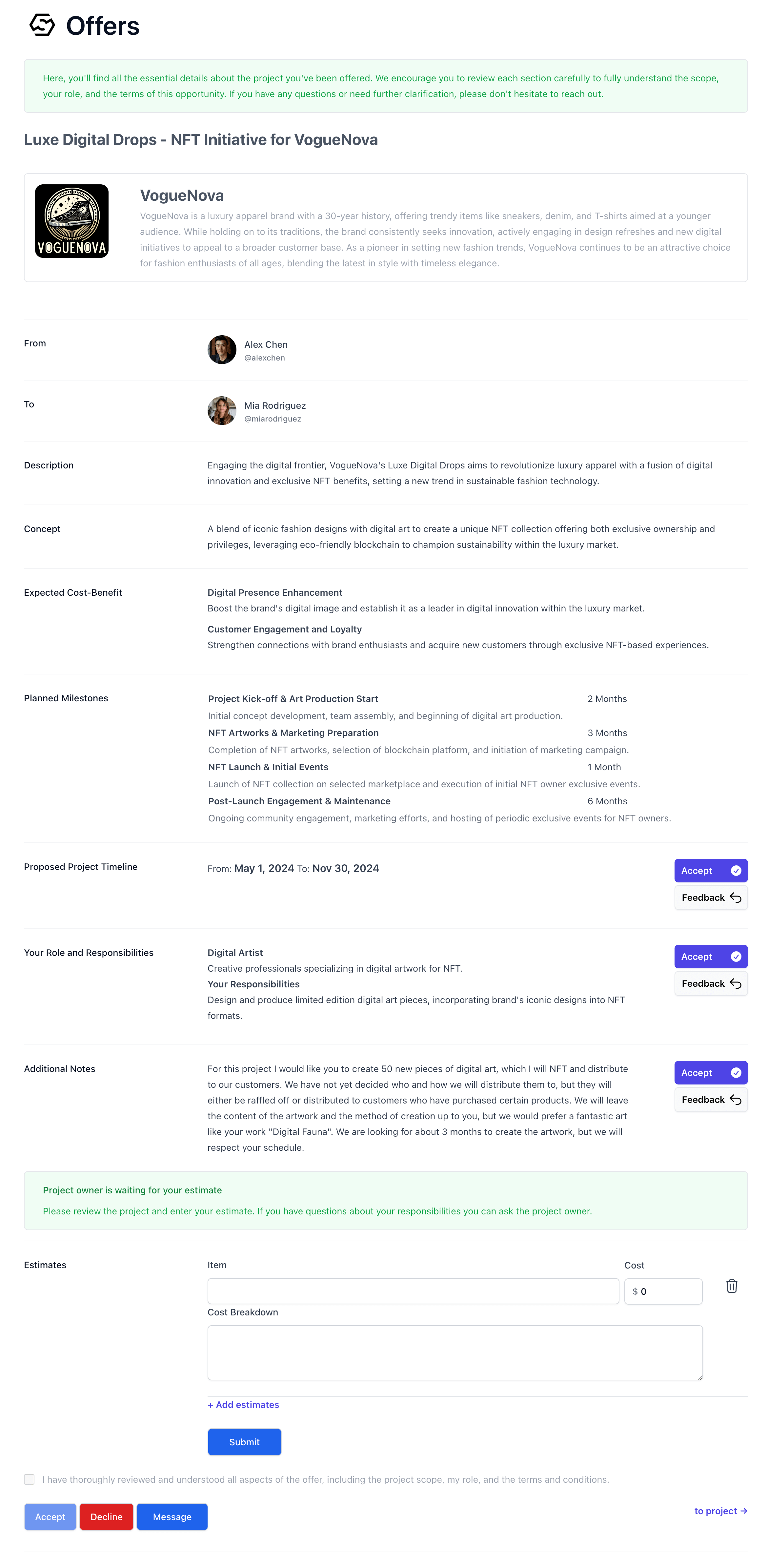 - Alex receives a notification that he has an estimate from Mia.