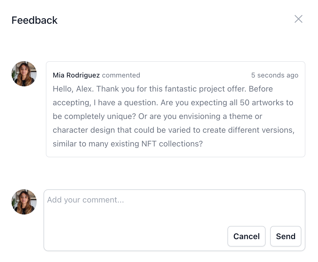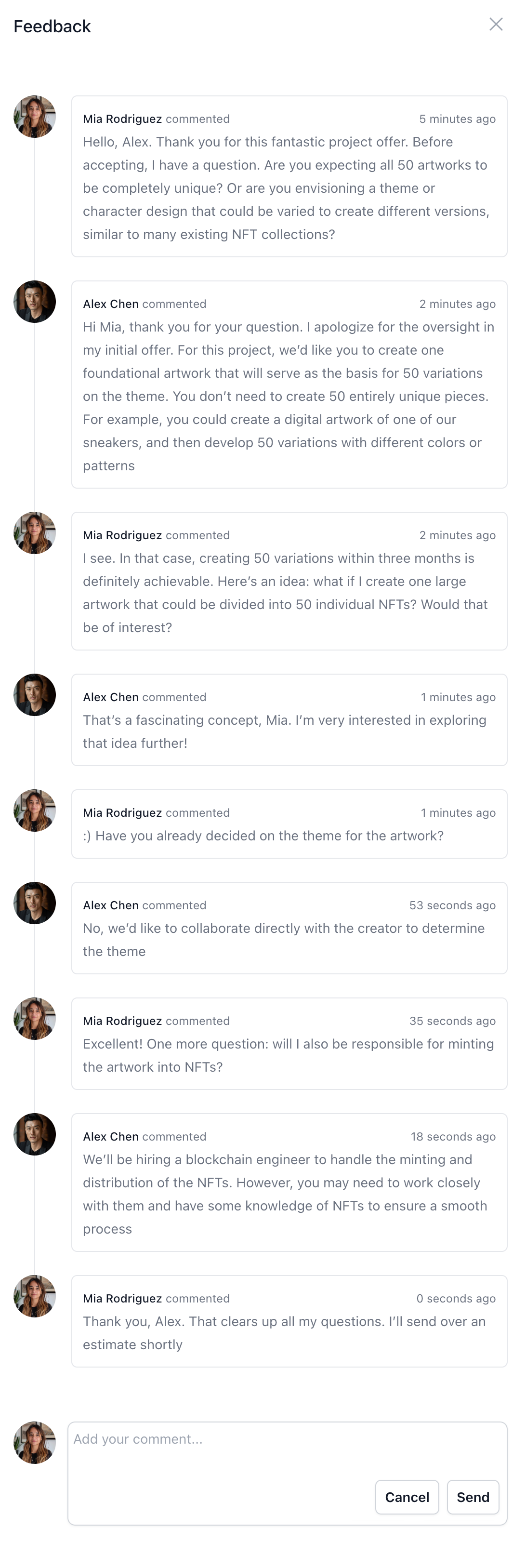 to share them with you and get your feedback.”As they hopped on the video call, Alex and Mia dove into a lively discussion about the project. Mia presented her initial ideas, and together they refined the concepts, exploring various artistic styles and visual elements that would best represent the brand’s message.Throughout the conversation, Alex was impressed by Mia’s creativity, professionalism, and deep understanding of the NFT space. Her insights and suggestions demonstrated her expertise and passion for the project.By the end of the call, they had a clear vision for the artwork and a solid plan for the next steps. Mia agreed to create a few rough sketches based on their discussion and send them to Alex for review within the next few days.As they wrapped up the meeting, both Alex and Mia felt energized and confident about the project’s direction. They knew that by combining their skills and working closely together, they had the potential to create something truly remarkable.