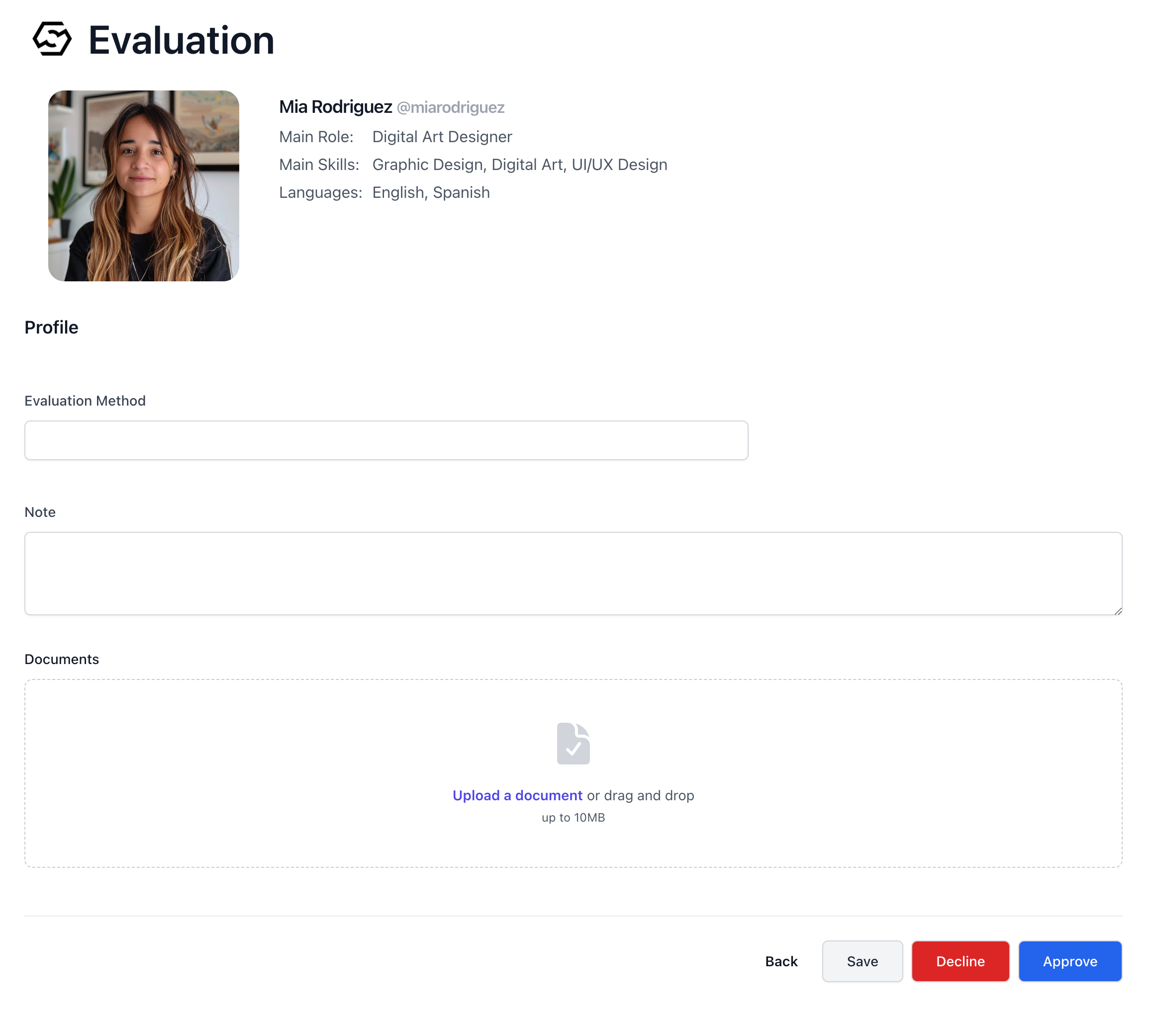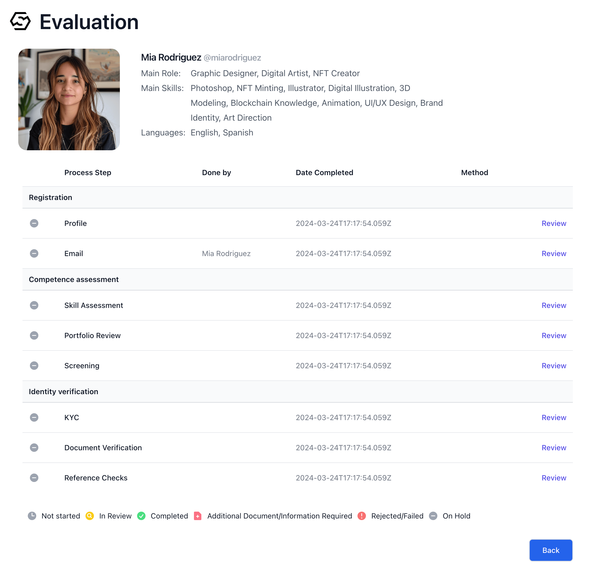 Reviewlink in the Profile section of the review items and pressesApprovebutton to approve Mia’s profile. See Vetting Process