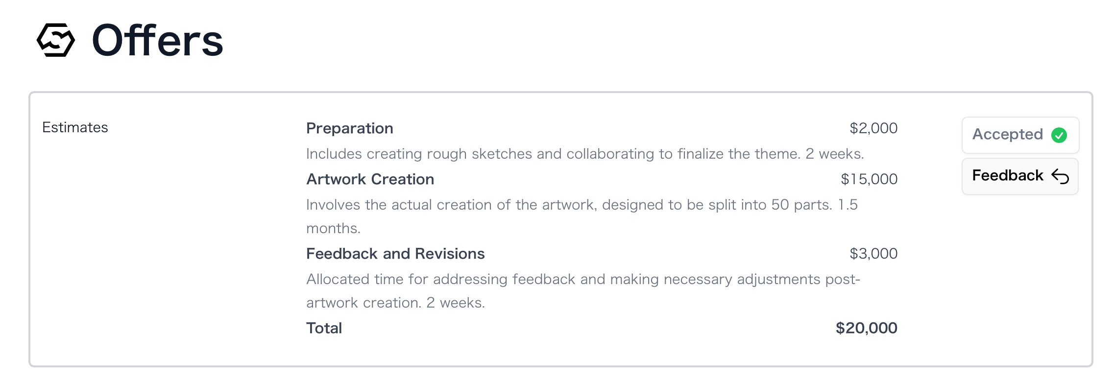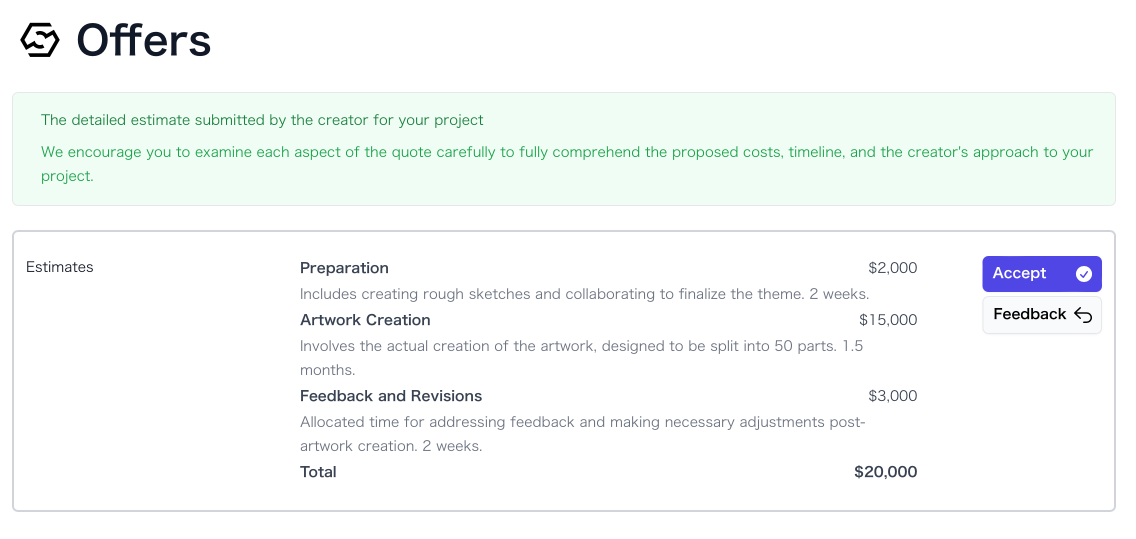 Mia received a notification that Alex had accepted her estimate. She carefully reviewed the project duration, responsibilities, and scope of work, ensuring that everything aligned with her understanding. Satisfied, she checked the box to accept the offer and submitted her response. Mia wondered if Alex had extended offers to multiple creators, and she hoped that he would ultimately choose her for the project.A Full House