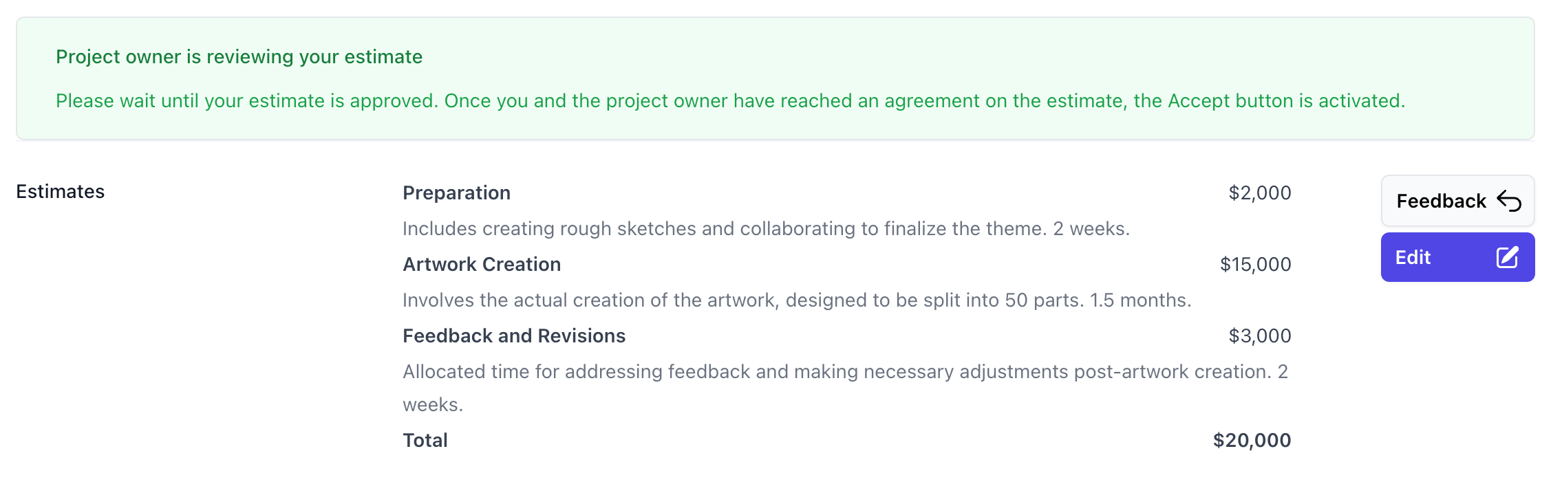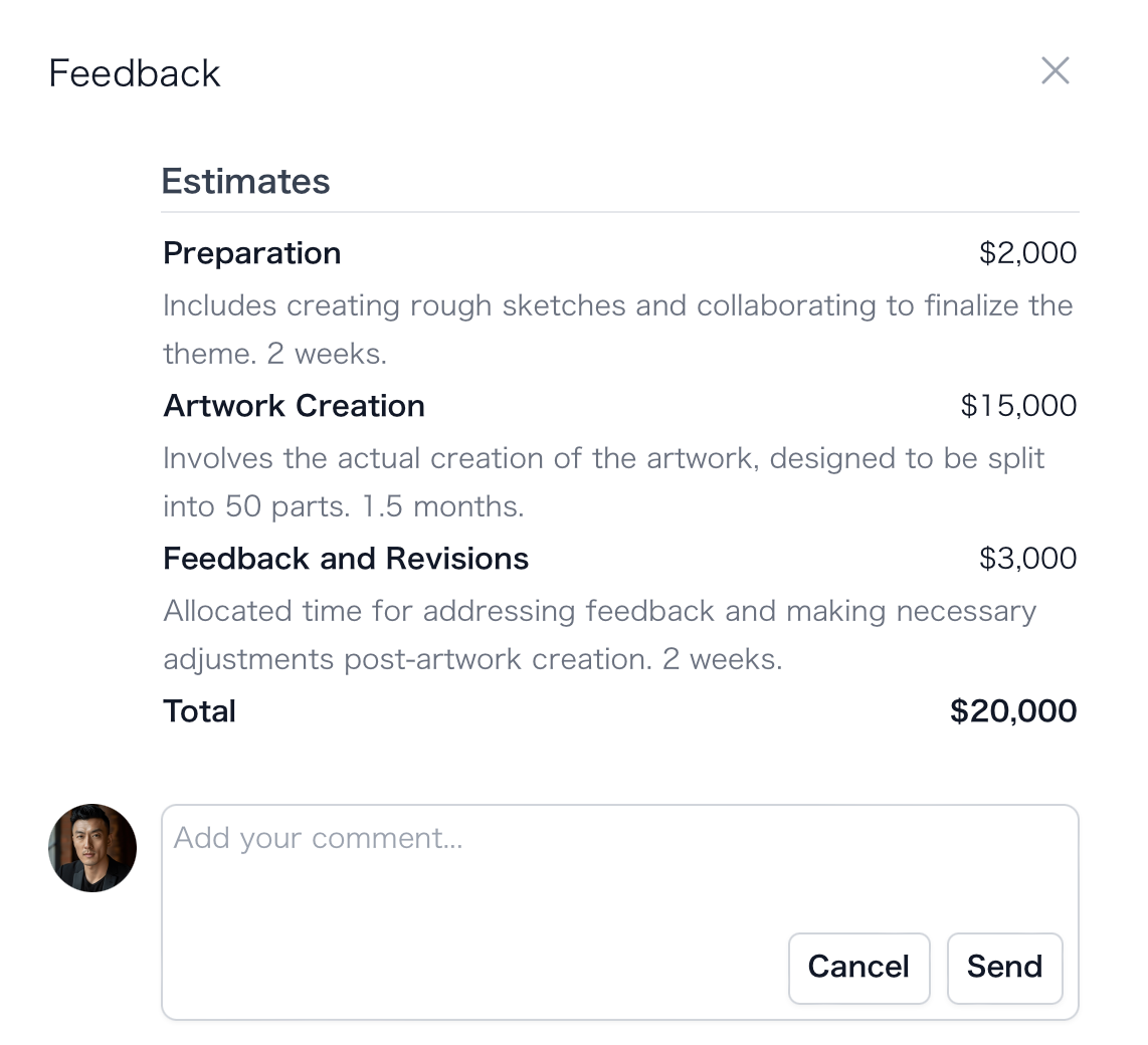 Mia contemplated the project estimate. She was quite proud of her idea to create one large artwork that could be divided into 50 NFTs. Typically, she would spend anywhere from two weeks to a month on a single piece. However, given the scale of this project and the need to create a cohesive artwork that could be split into 50 parts, she estimated that it would take over a month to complete.As a result, her per-piece estimate would be two to three times her usual rate. She also accounted for the time needed to create rough sketches and collaborate on finalizing the theme. Mia outlined a schedule that included a two-week preparation period, a month and a half for artwork creation, and two weeks for addressing feedback. Based on these factors, she arrived at an estimate of $20,000 and sent her proposal to Alex.How to test