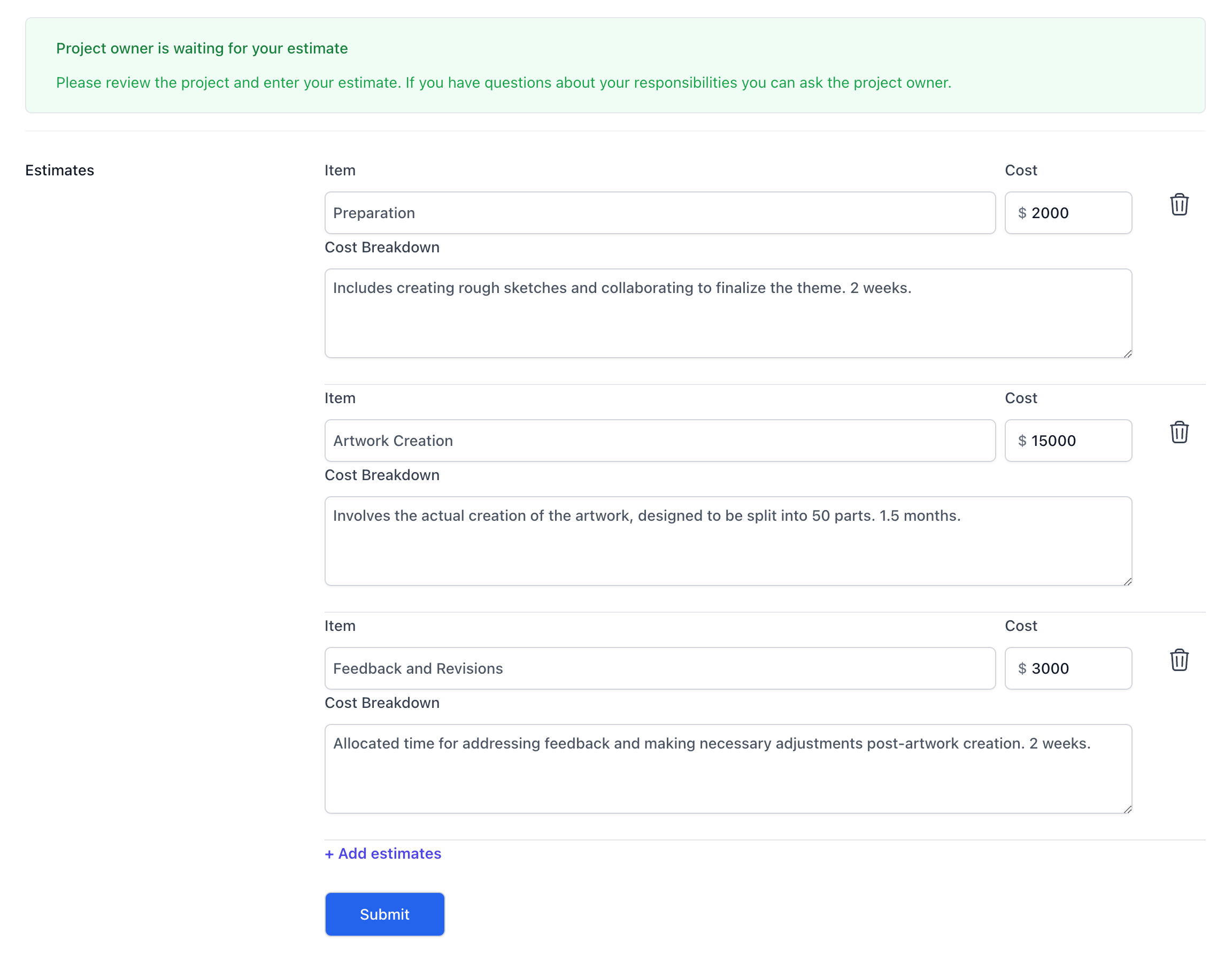 Submitbutton - She sees the estimate sent to Alex
